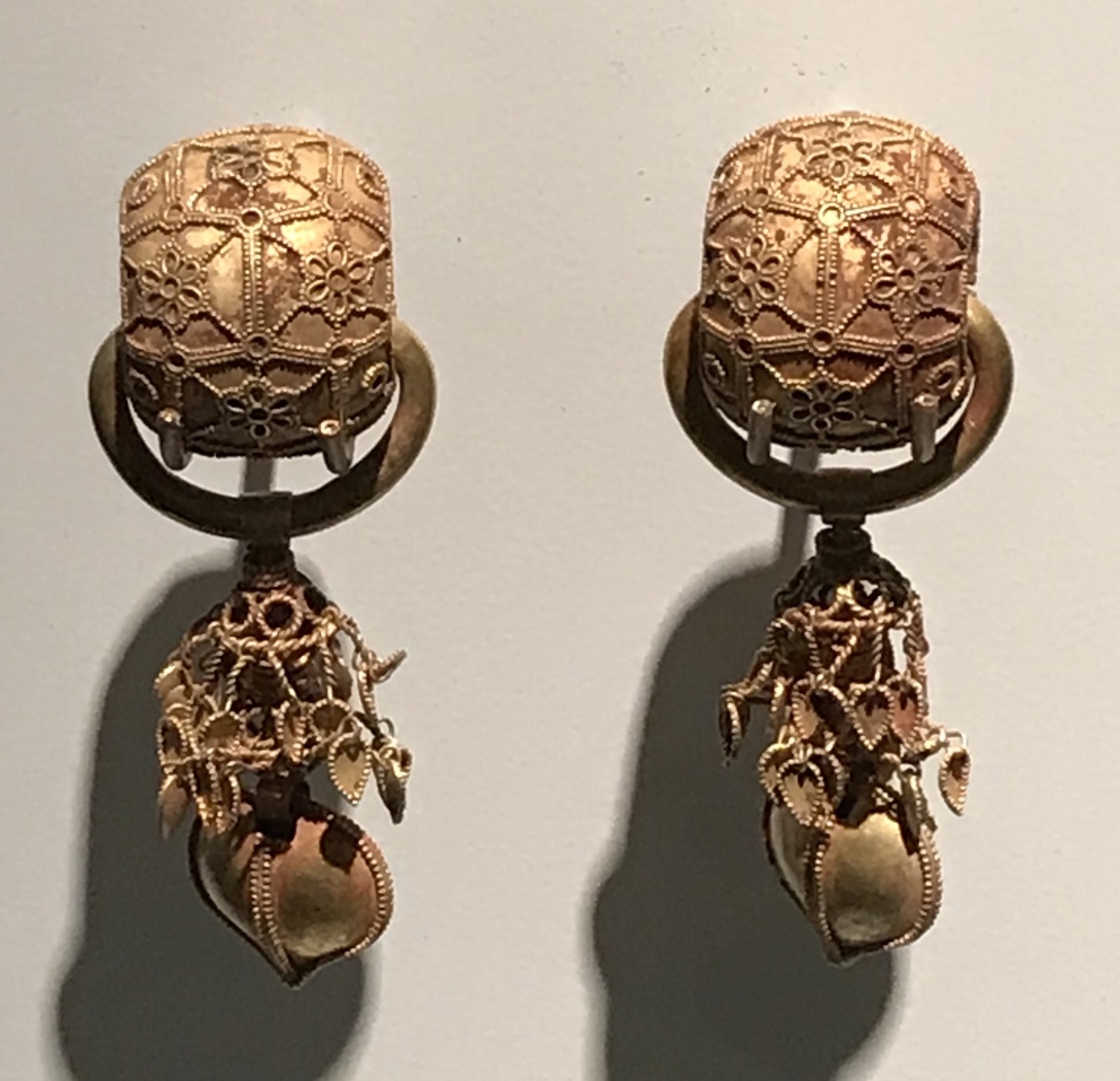 以及,放一张前些天在布鲁克林博物馆拍的,6 世纪新罗的金耳坠。这种把金子做成小颗粒(granulation,不知道怎么翻译)来装饰产品的技术,被认为是公元前 18 世纪在美索不达米亚出现的,传到波斯、希腊、罗马,又经由中亚传到东亚地区。可见丝绸之路东到朝鲜半岛(而非西安/洛阳/北京),是没有错的。文中提到新罗的金耳坠,就是因为作者突然看见了这个。(~ ̄▽ ̄)~