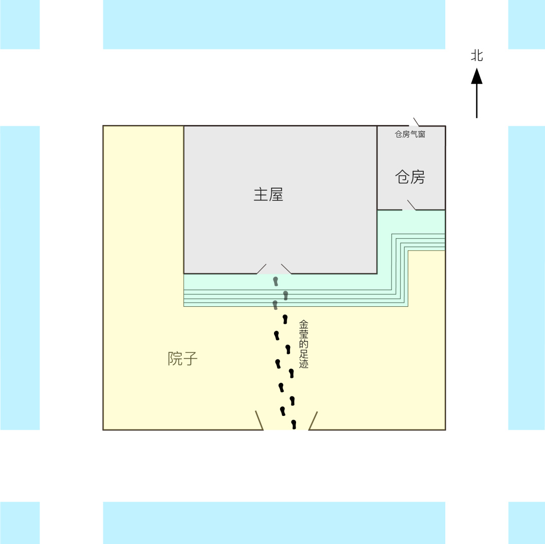 “那就是说,门口的台阶上——”小希指着图上相应的位置,“从主屋到仓房这一段——有金莹和梁皓的脚印。”